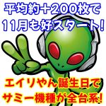 11月1日(水)|エスパス渋谷新館|11月は台平均約+200枚の好スタート!アイム・カバネリなどの多台数機種の全台系に加えて1/2系などの仕掛けを多数用意!エイリやんの誕生日に絡めた仕掛けもあり!