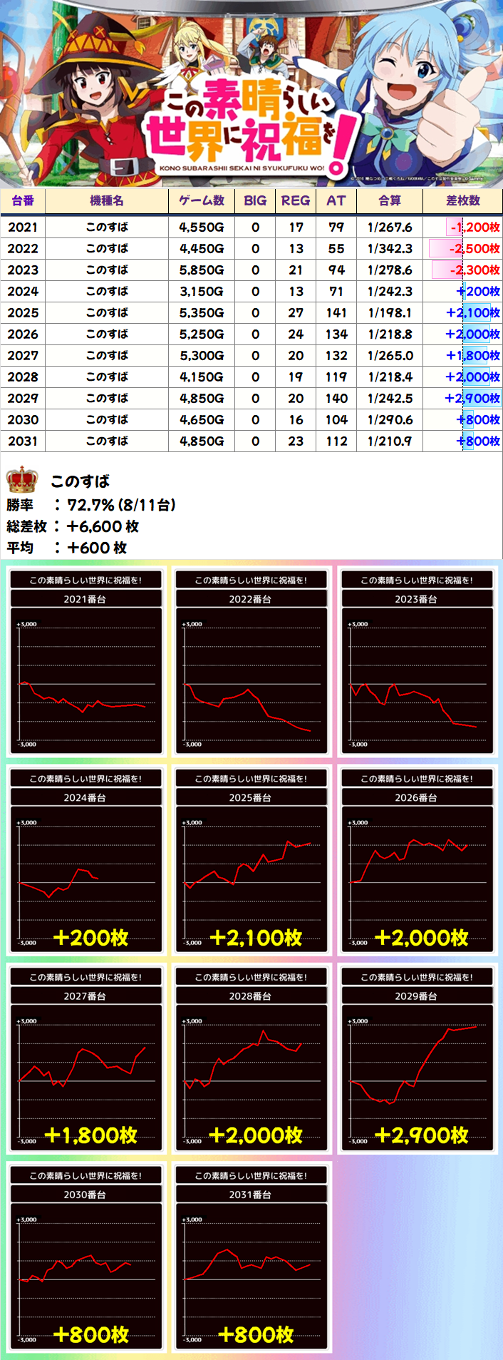 11台設置の「このすば」は11台中8台がプラスで平均+600枚の結果に!