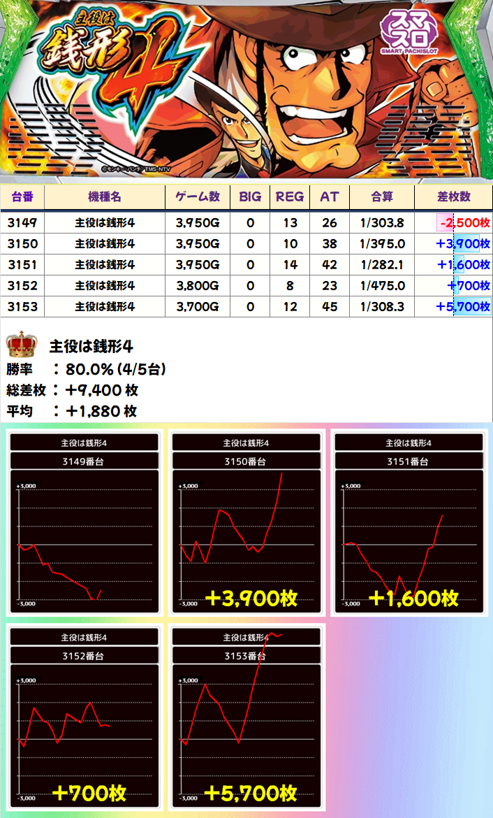 5台設置の「主役は銭形4」は5台中4台がプラスで平均+1,880枚の結果に!