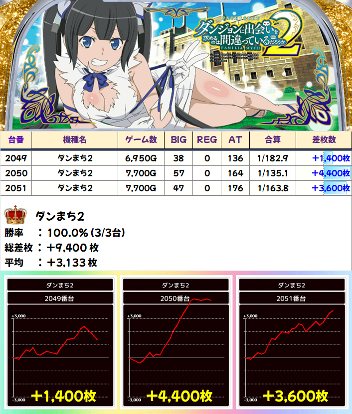 3台設置の「ダンまち2」は3台全台がプラスで平均+3,133枚の結果に!