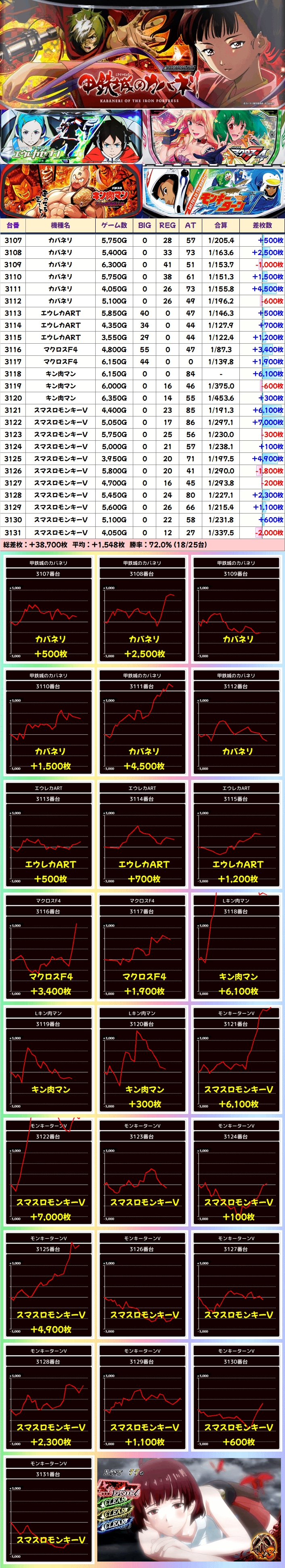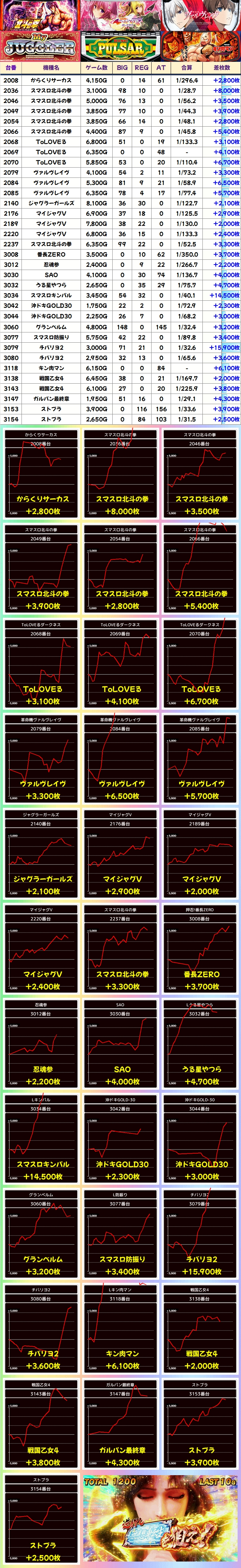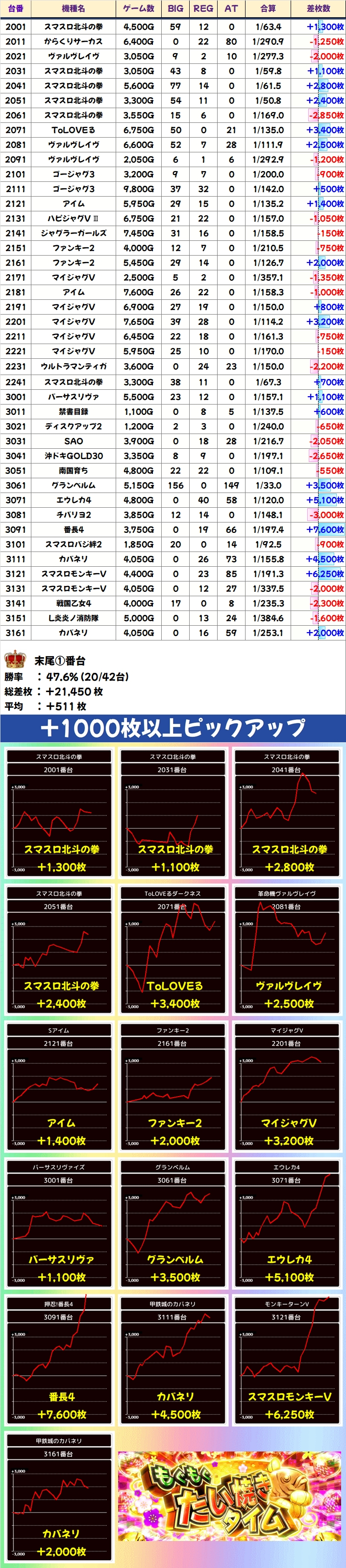 今回は末尾①番台から優秀台を多数確認でき、エウレカ4・番長4・モンキーターンVから+5000枚超の台が出現!