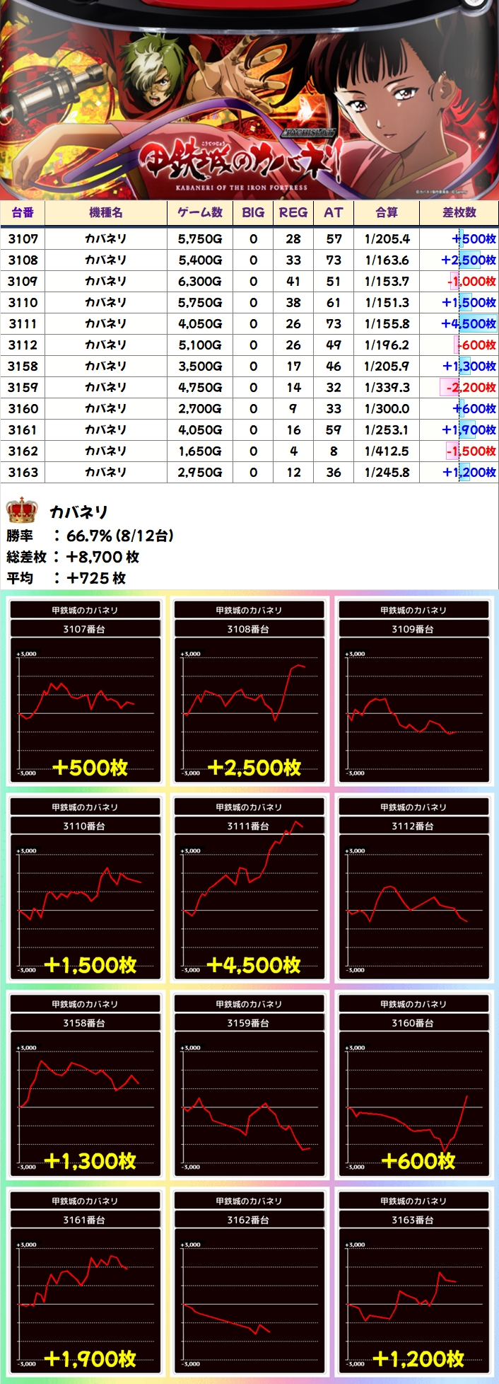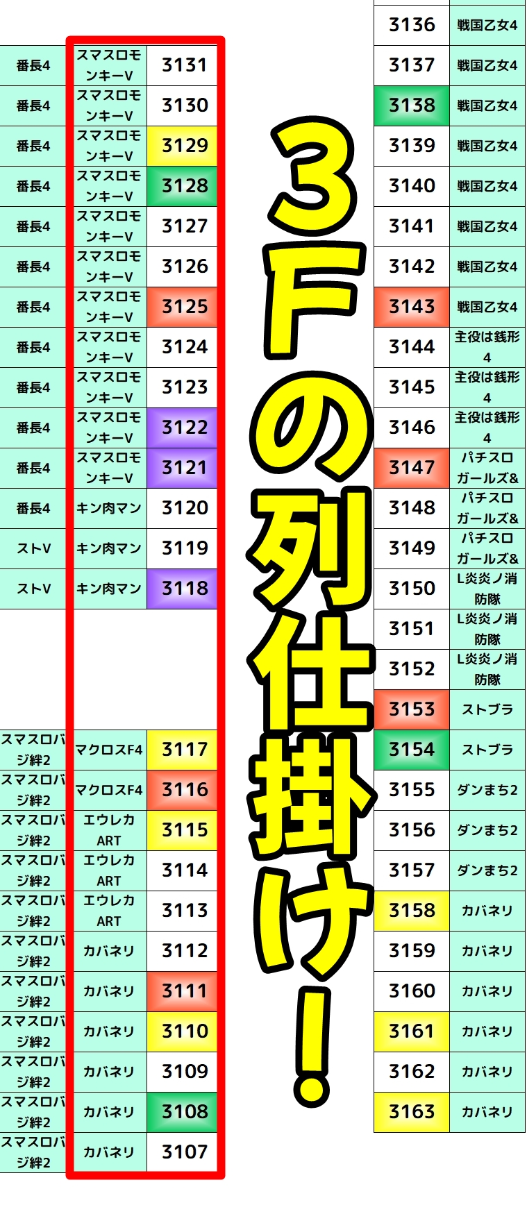 また、3Fの3107番台~3131番台の列も平均+1500枚超と好結果を残していました。