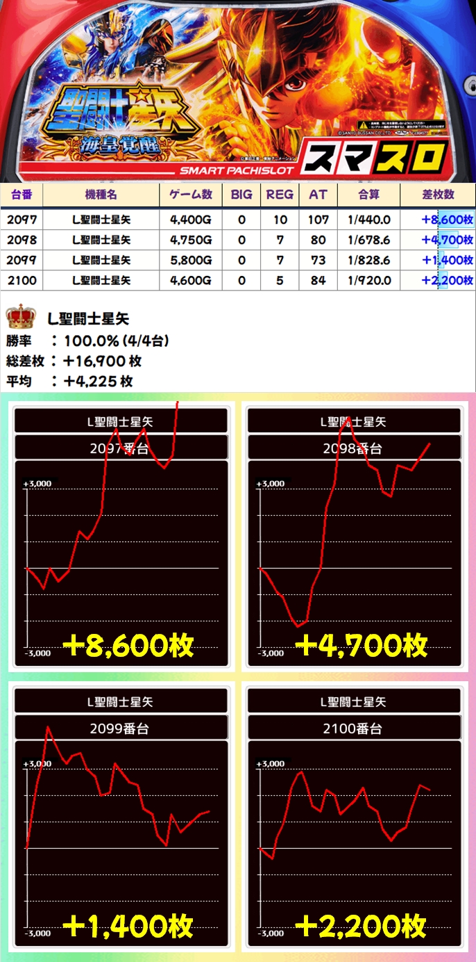 列仕掛けでも紹介した通り上記5機種が全台系濃厚の結果になっており、新台のL聖闘士星矢が全台プラスかつ平均+4000枚オーバーと大幅プラスを記録!
