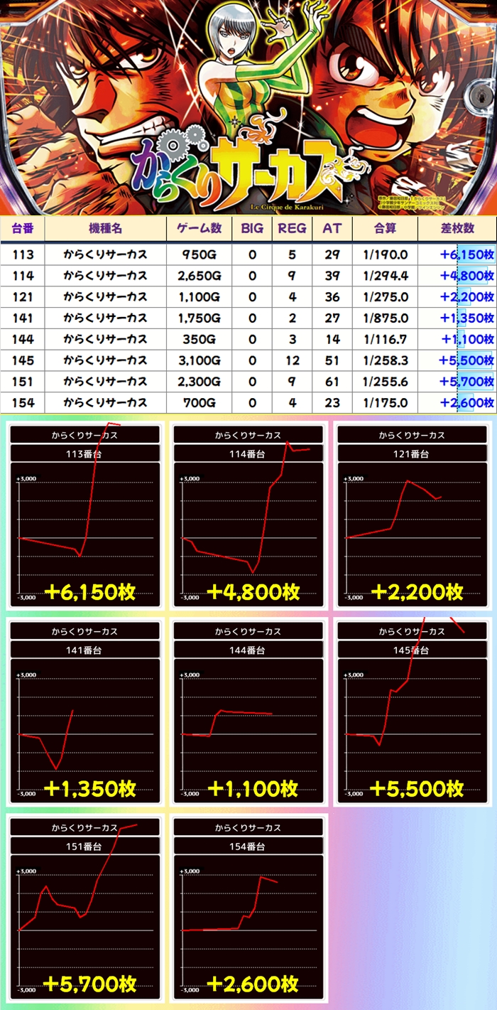 「からくりサーカス」からは3台が+5000枚オーバー!平均差枚もプラスでフィニッシュ。