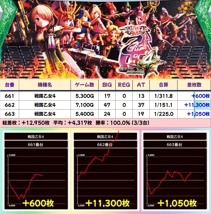 高配分扱いの番長4を除いた+2000枚超の毎日カブくぜ機種をピックアップ。並びがあった戦国乙女4は並び以外からも大量獲得が出現しました。