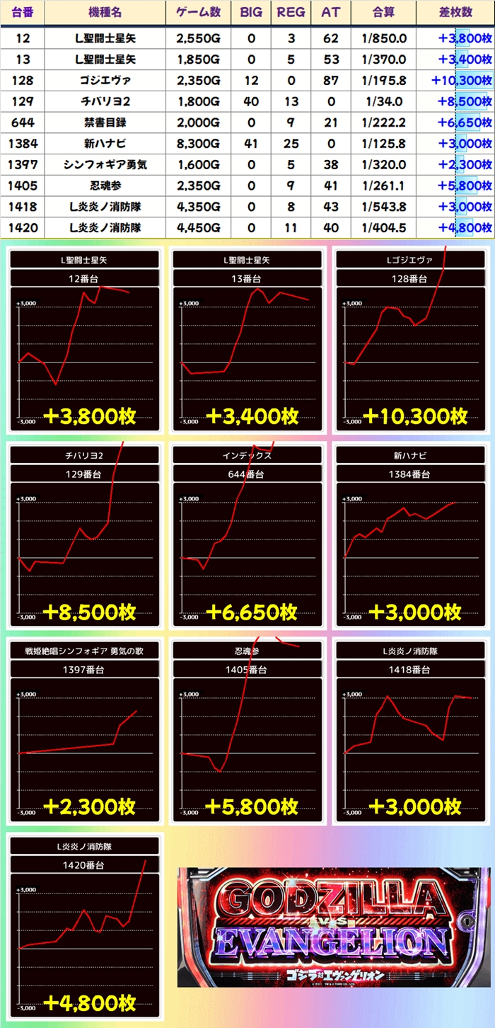 万枚超のゴジエヴァをはじめ、多くのスマスロから+3000枚超台を確認。仕掛け以外にも単品で優秀台が複数使われていたことでしょう。
