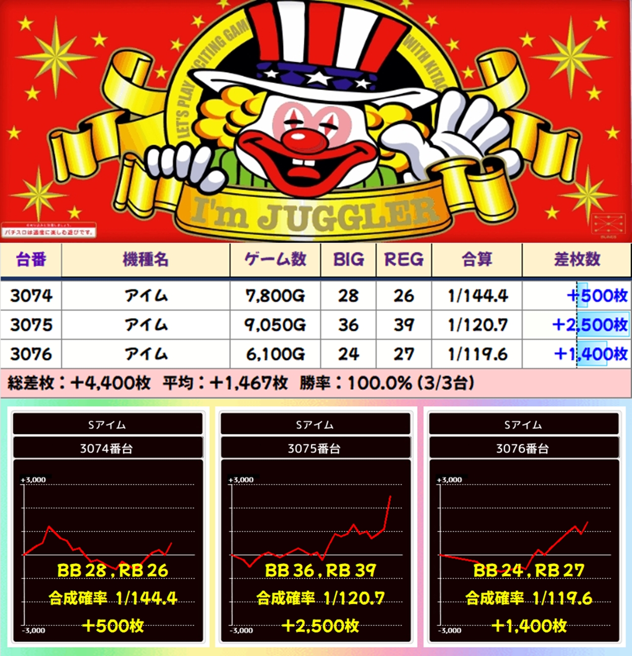 末尾⑤のジャグは2台が若干のマイナスとなってしまいましたが、マイジャグVから+6,000枚やファンキー2から+3,950枚といった大量出玉も確認でき、平均では+2,119枚の好結果に!