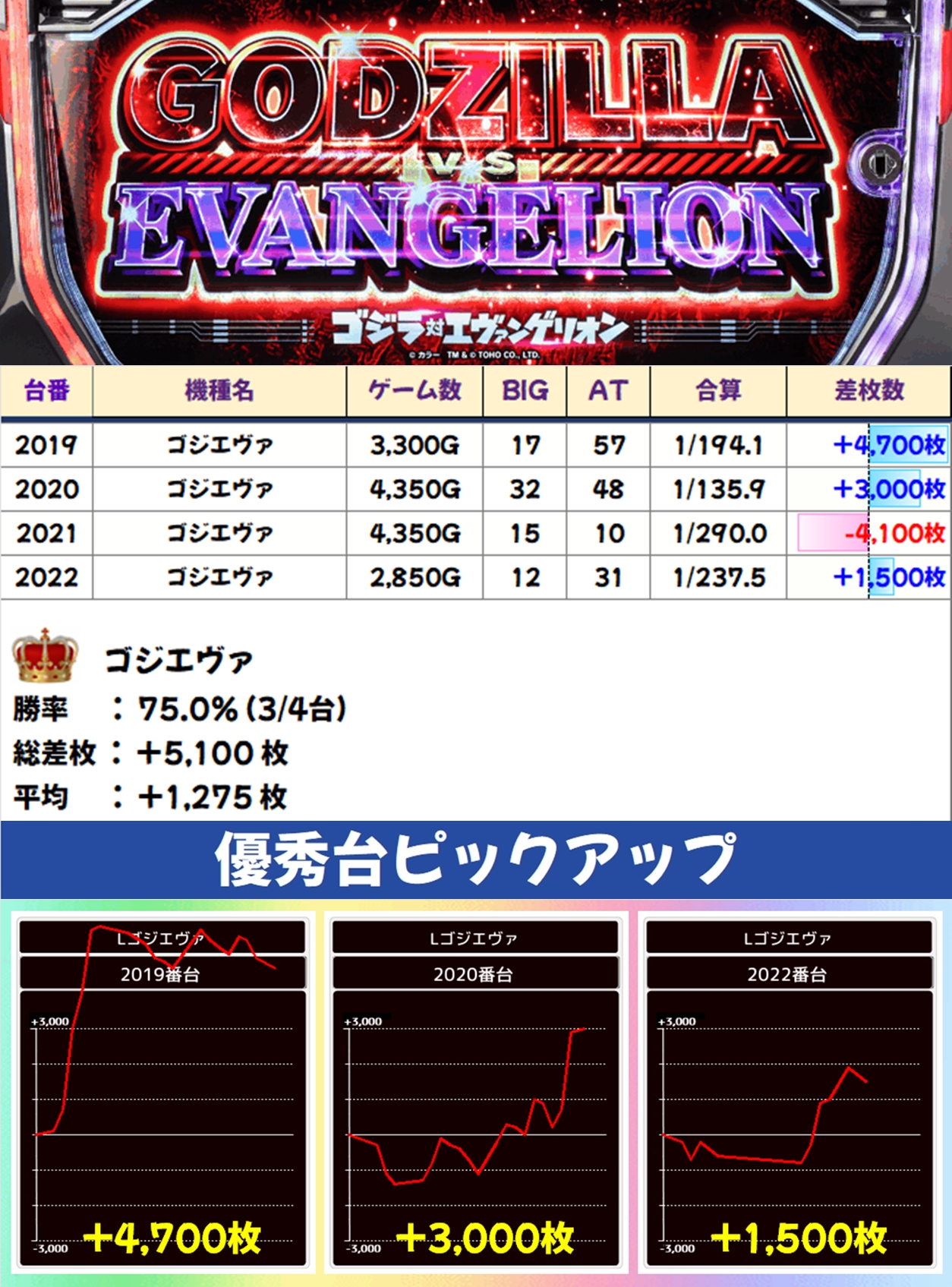 ゴジエヴァは4台中3台がプラスとなり、+4,700枚の大量出玉も確認。こちらは1/2系濃厚だったと思われます。