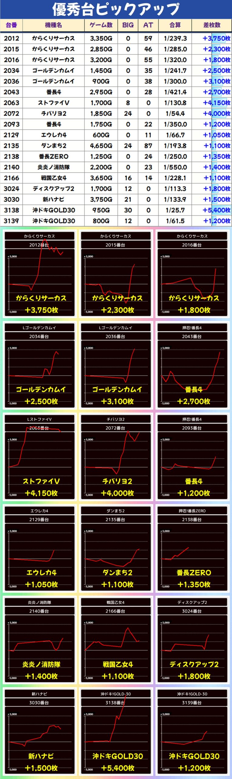 ジャグラーシリーズやポスター機種など、ここまでピックアップした仕掛け以外にも優秀な出玉を多数確認することができました。沖ドキGOLDから+5,400枚やストファイVから+4,150枚、チバリヨ2から+4,000枚、からくりサーカスから+3,750枚など、スマスロをメインに盛り上がりを見せておりました。