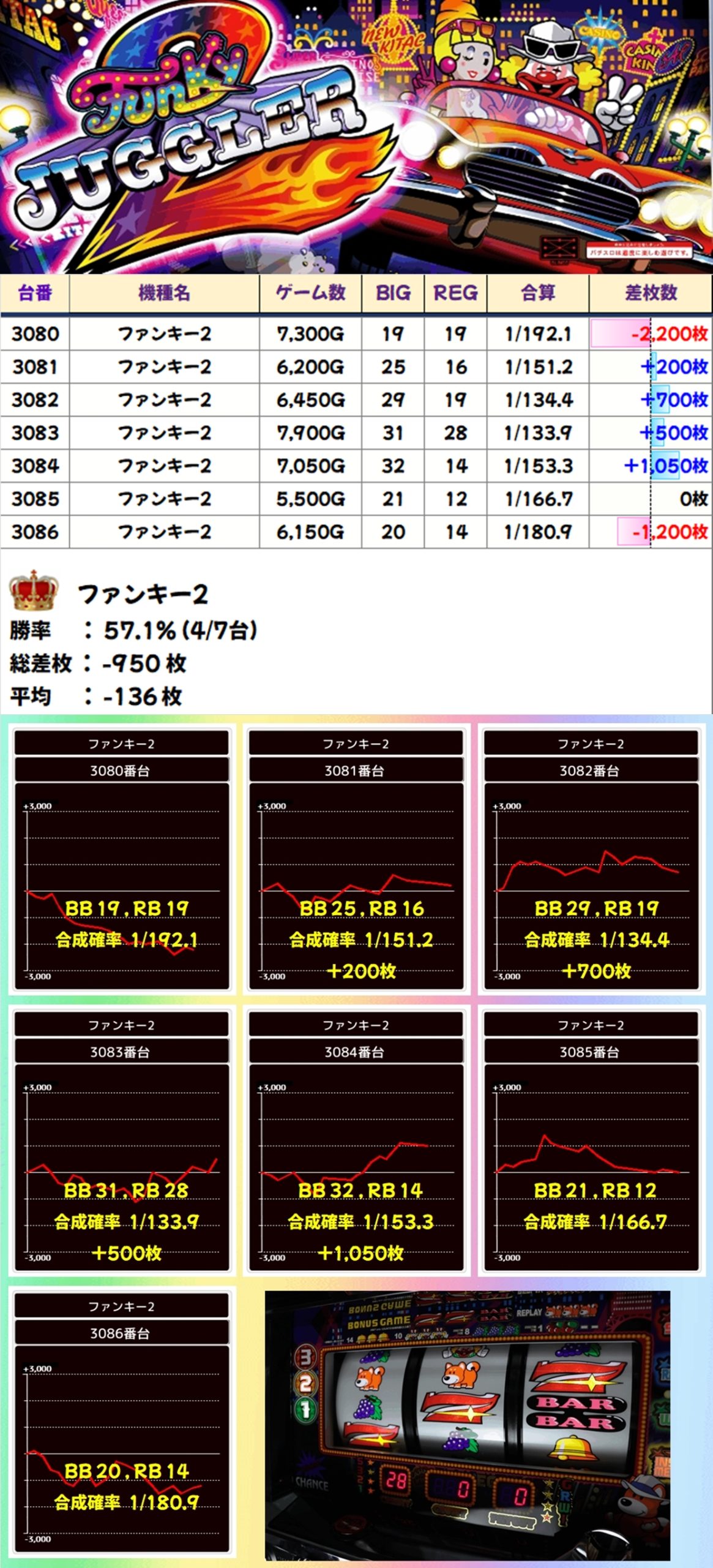 ファンキー2は平均がマイナスとなってしまったものの、勝率などを見る限り1/2系濃厚だった可能性が高いと思われます。また、マイジャグV、ゴージャグ3、ジャグラーガールズからも優秀な出玉を確認。日曜日のジャグはとにかく多くのチャンスがあります!