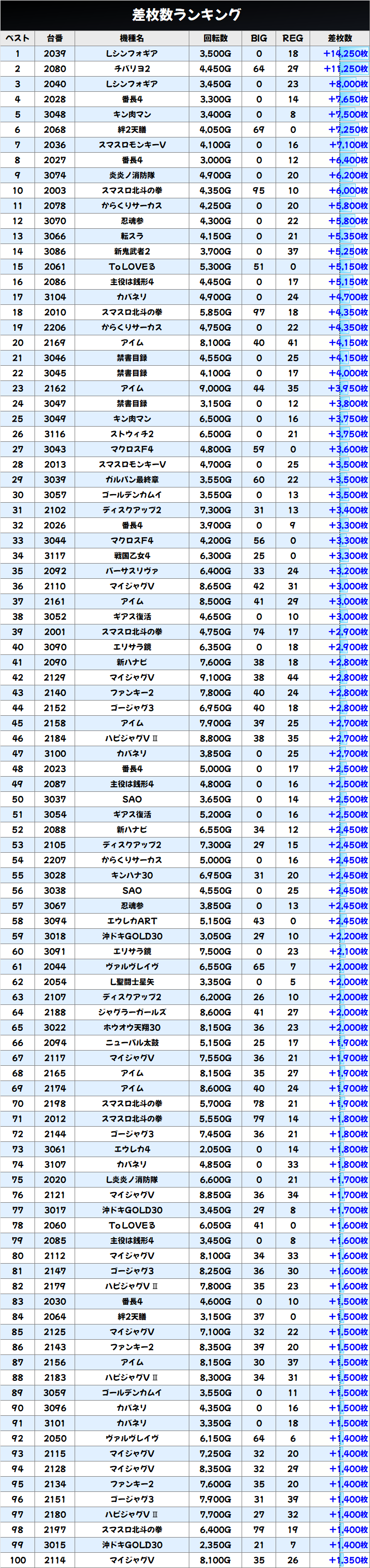 複数の万枚を筆頭に+5000枚以上が16台、+3000枚以上が38台、+2000枚以上が65台、+1000枚以上に至っては112台!