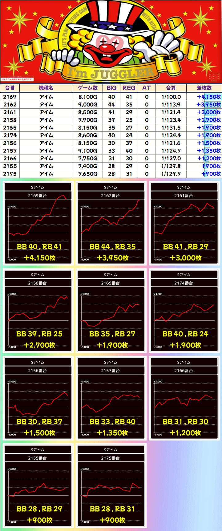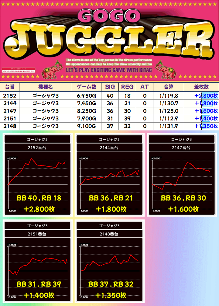 当然それだけ出れば全体でも出ているのは必然。平均差枚+338枚&総差枚+10.7万枚超とバッチリ結果を残しました!