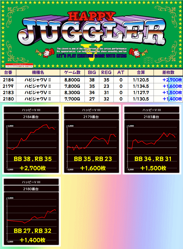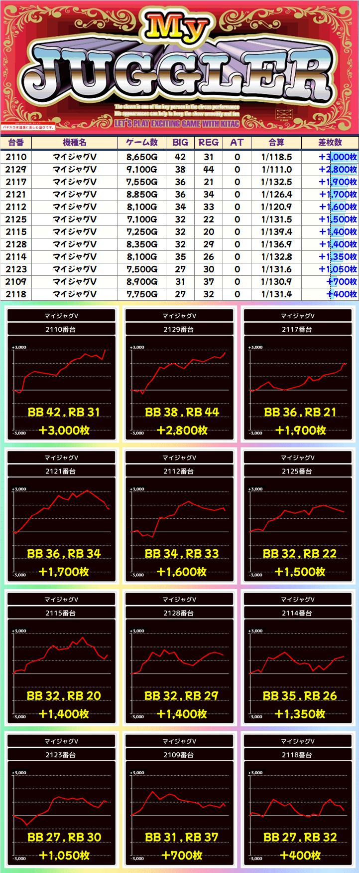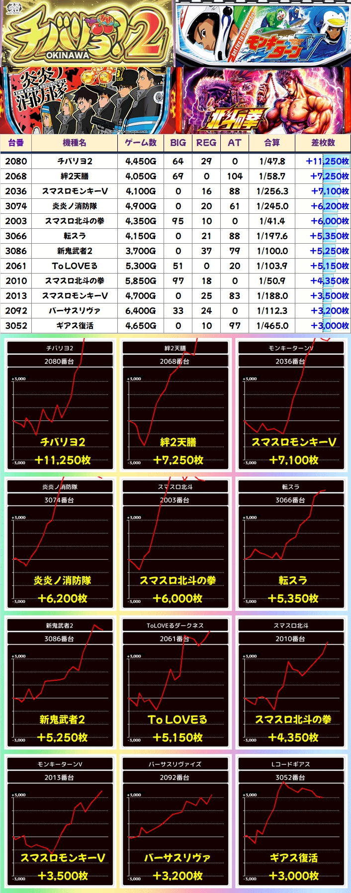 各機種に+2000枚以上を筆頭に優秀台が多数出現!