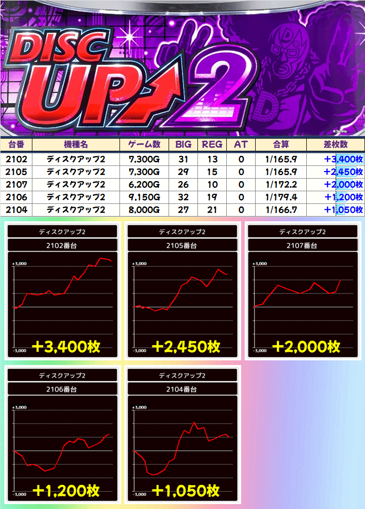 ちなみに+3400枚を筆頭に8台中5台が+1000枚以上だった「ディスク2」は今回で3連続で仕掛け対象でした! 次回は果たして!?