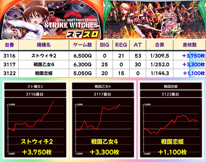 また、最近強化傾向が顕著のバラエティからも「ストウィチ2」「戦国乙女4」の+3000枚以上などの優秀台も出現!