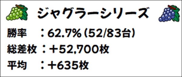 もちろん他のジャグも高配分濃厚で、全ジャグがプラス。全体でも勝率62%超&総差枚+5.2万枚超と抜群の結果を残しました!