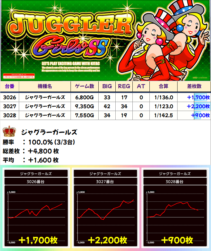 ジャグラーガールズ(3/3台+)⏩Ave+1,600枚