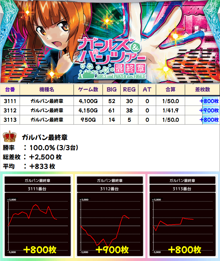 全台系濃厚機種はやはり少台数機種を中心に仕掛けられています。最新台のスマスロシンフォギアからは万枚も確認でき勝率100%。乙女やガルパン最終章などのスマスロもおそらく全台系濃厚。また、日曜日といえばジャグ系がとくに強く、今回も全台系濃厚とみられるジャグがありました!