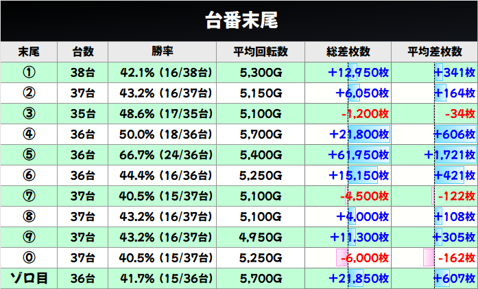 半分以上の末尾がプラス差枚ですが、その中でも末尾⑤がブッチ切りで強く、1台あたりの平均差枚が1500枚overと完全に別世界!!