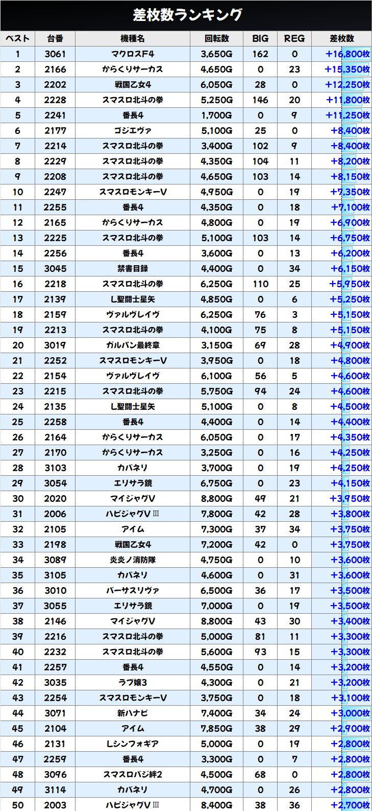 上位陣はスマスロで埋められており、万枚が5台もあります。そしてスマスロ北斗の名前が多いですね。並び仕掛けは前回6/14でも多かったので、周年日の本命機種と考えても良いかも?