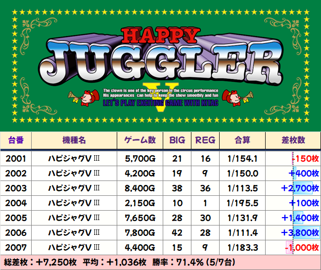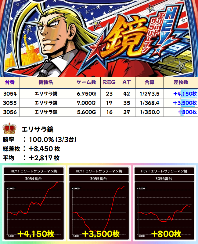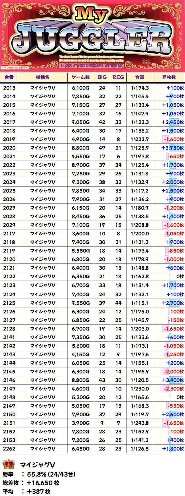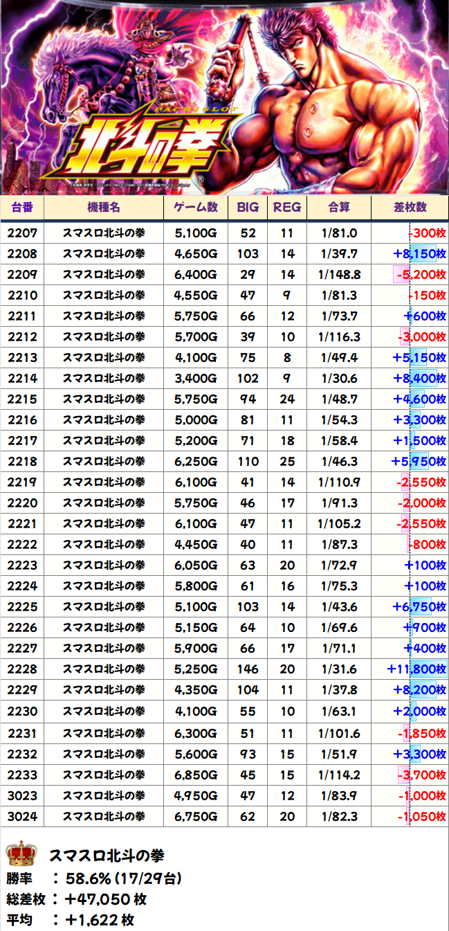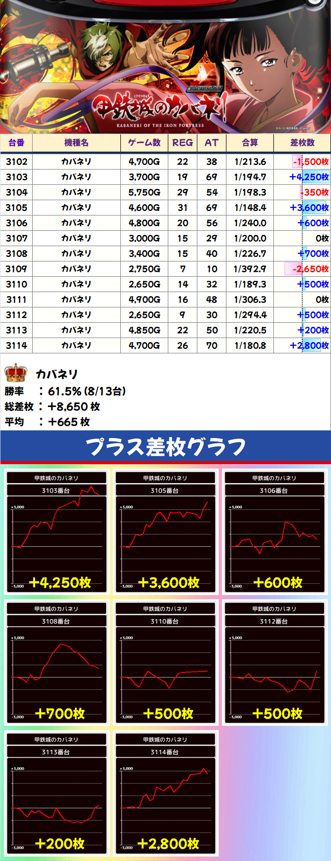 7/7の勢いを彷彿とさせる強力な出玉!上のデータをみても青字(プラス)が塊で多く、並び仕掛けと思われます。下記の抜粋データをみても、+100枚とかの不発台が極端なマイナスがなく戦えている挙動を見せていることがわかると思います。