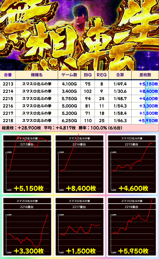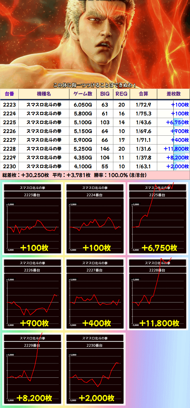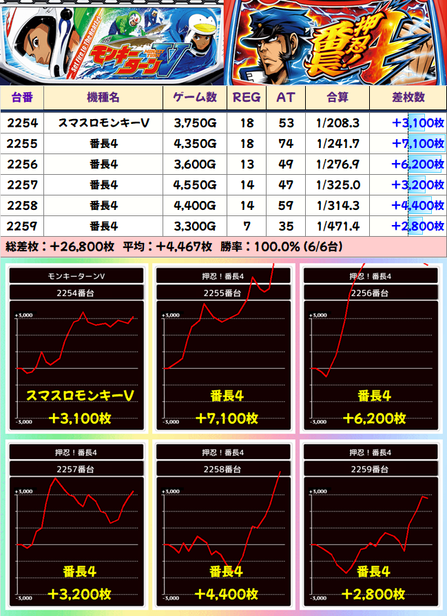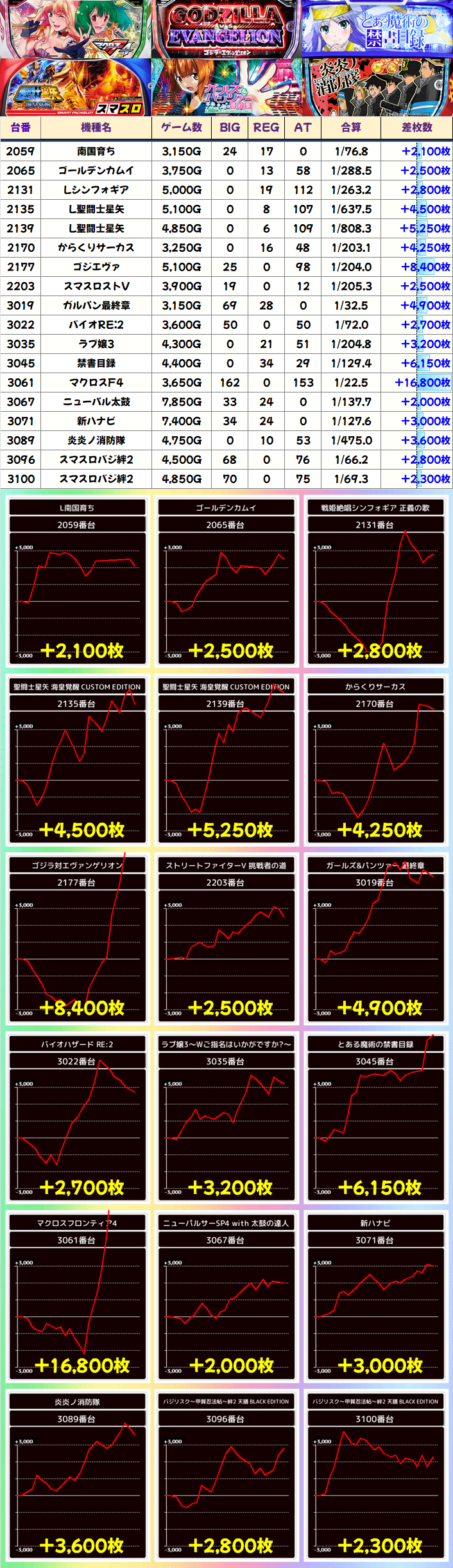 柱で区切られた隅の機種シマが6台並びで猛爆。ほとんどが右肩上がりの挙動で、全台ほぼ3000枚以上プラスに。