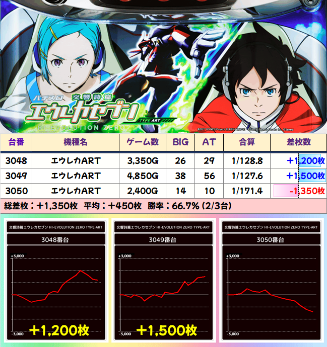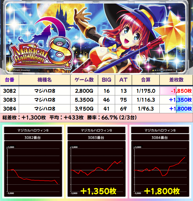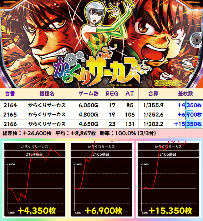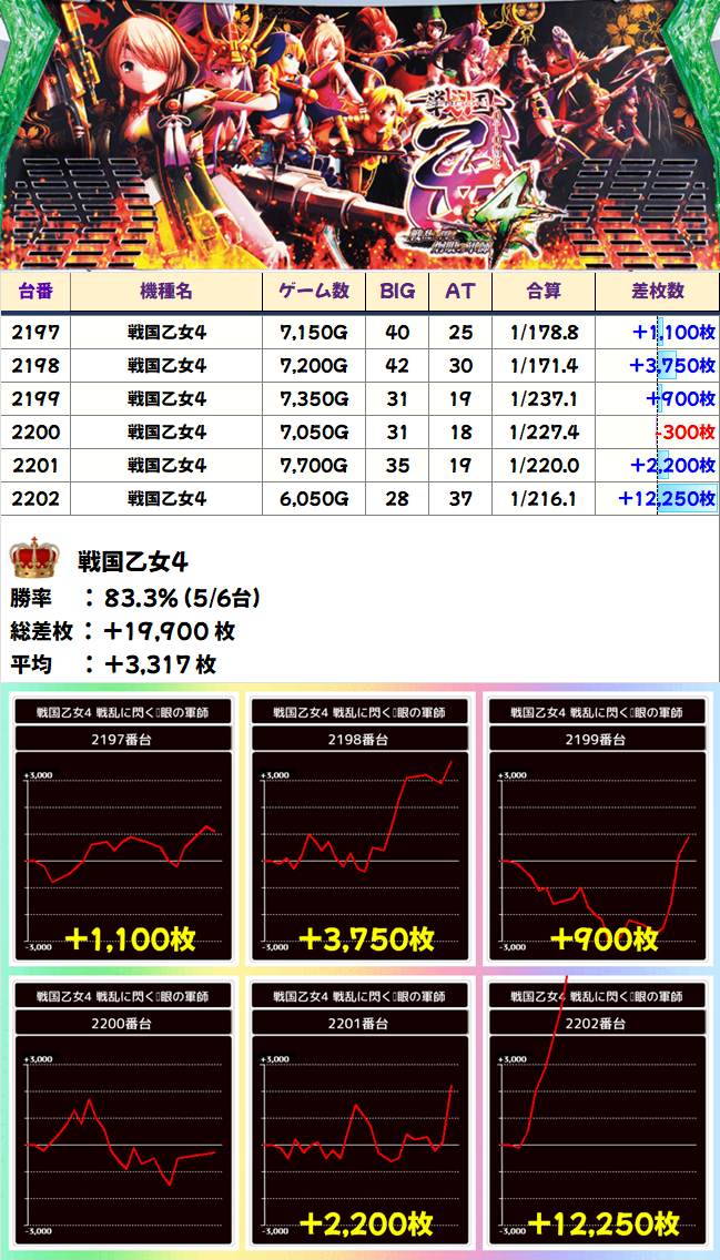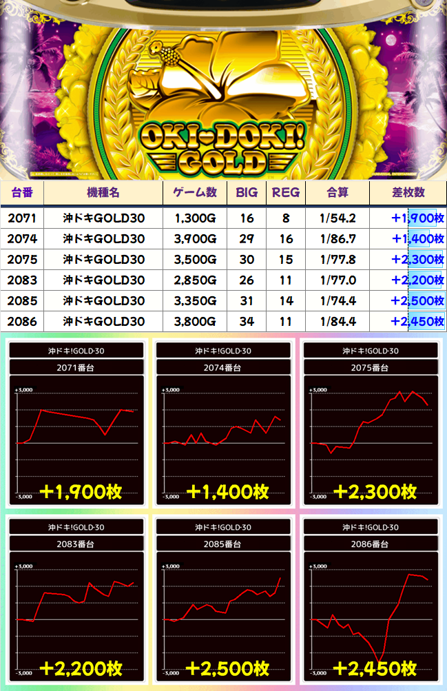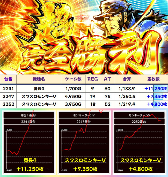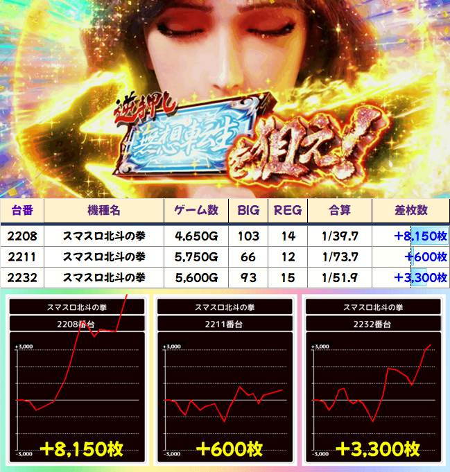 柱で区切られた隅の機種シマが6台並びで猛爆。ほとんどが右肩上がりの挙動で、全台ほぼ3000枚以上プラスに。