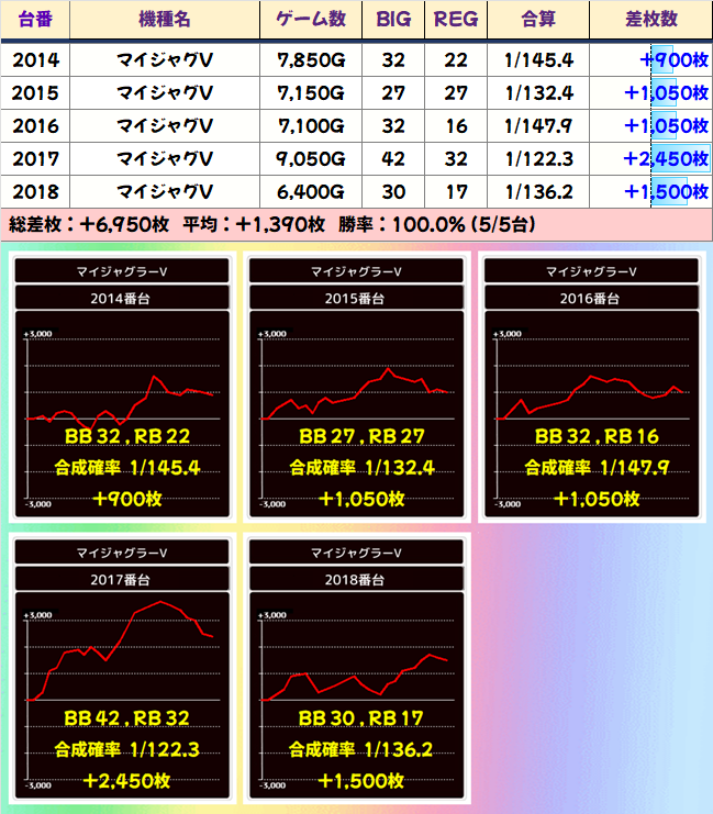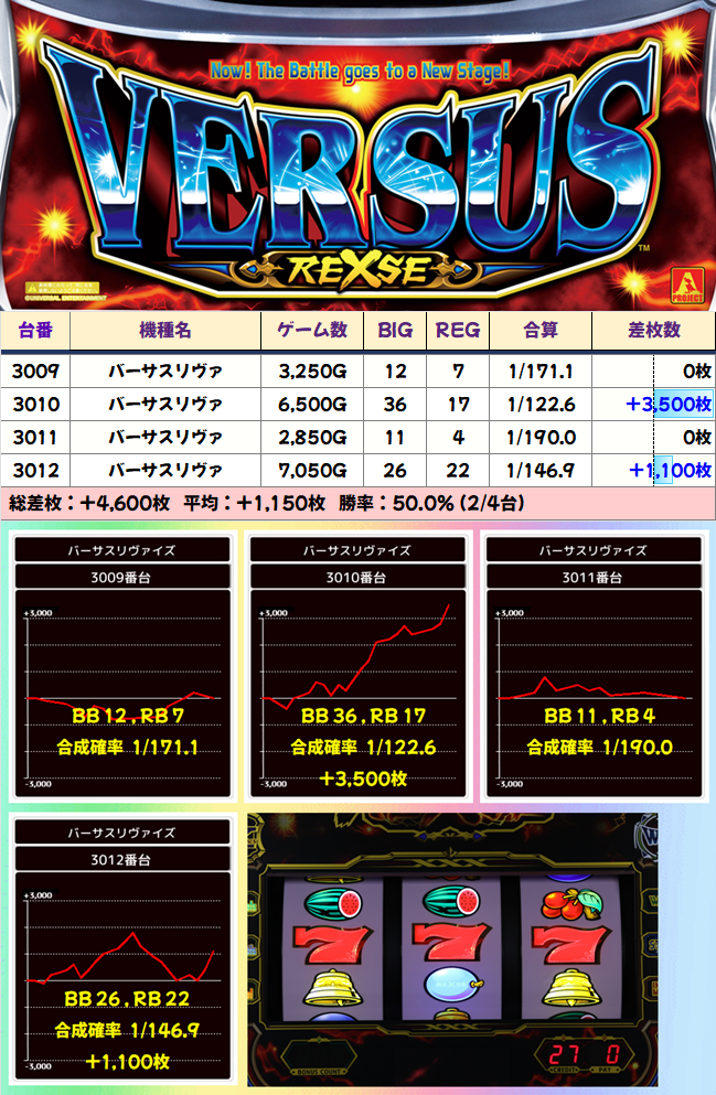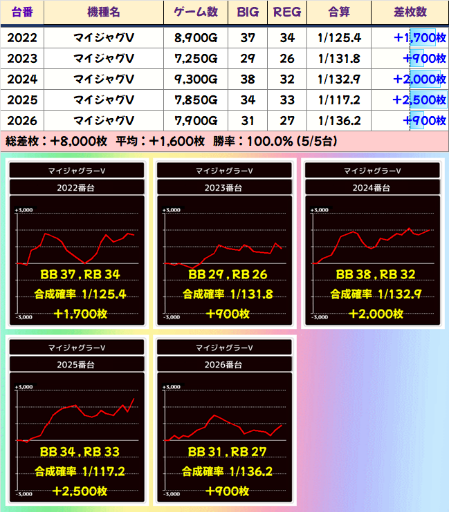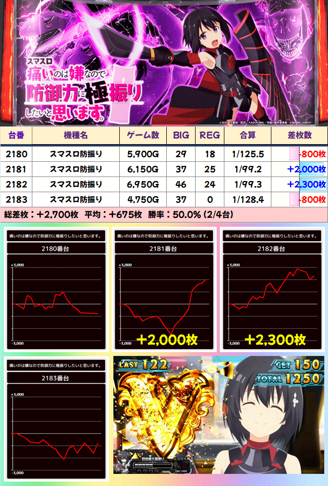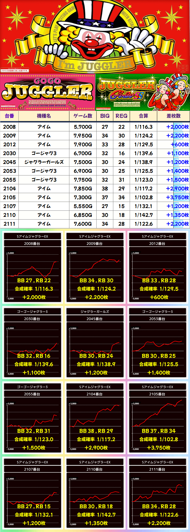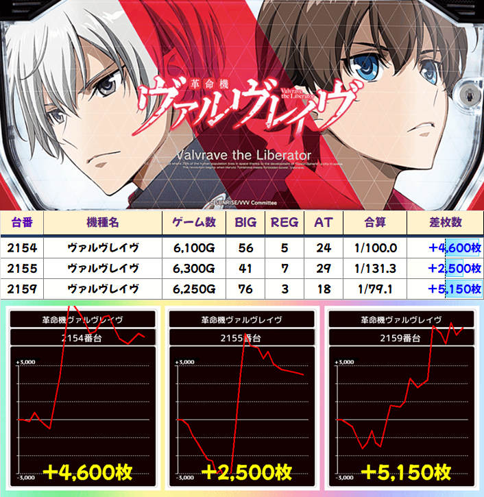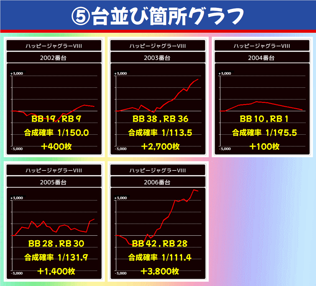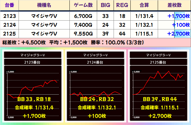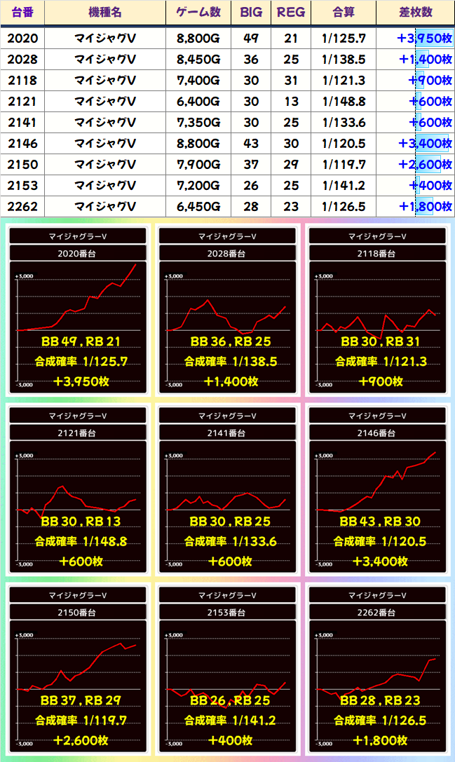 ハラキリの一撃が2台、小刻みの出方をした2159番台は一見するとヴヴヴのグラフに見えないかもしれません。