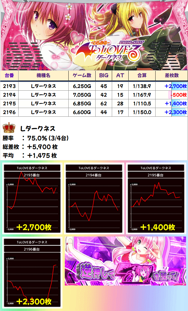 2194番台は不発で終わったものの、7000G回されてます。2195番台は楽園計画による一撃がなくこの台らしからぬ穏やかなプラス終焉。