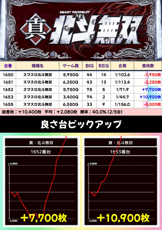 スマスロ北斗の拳から+5650枚が2台・新台のバハマ30から+5450枚など、まだまだ優良機種が多数存在!