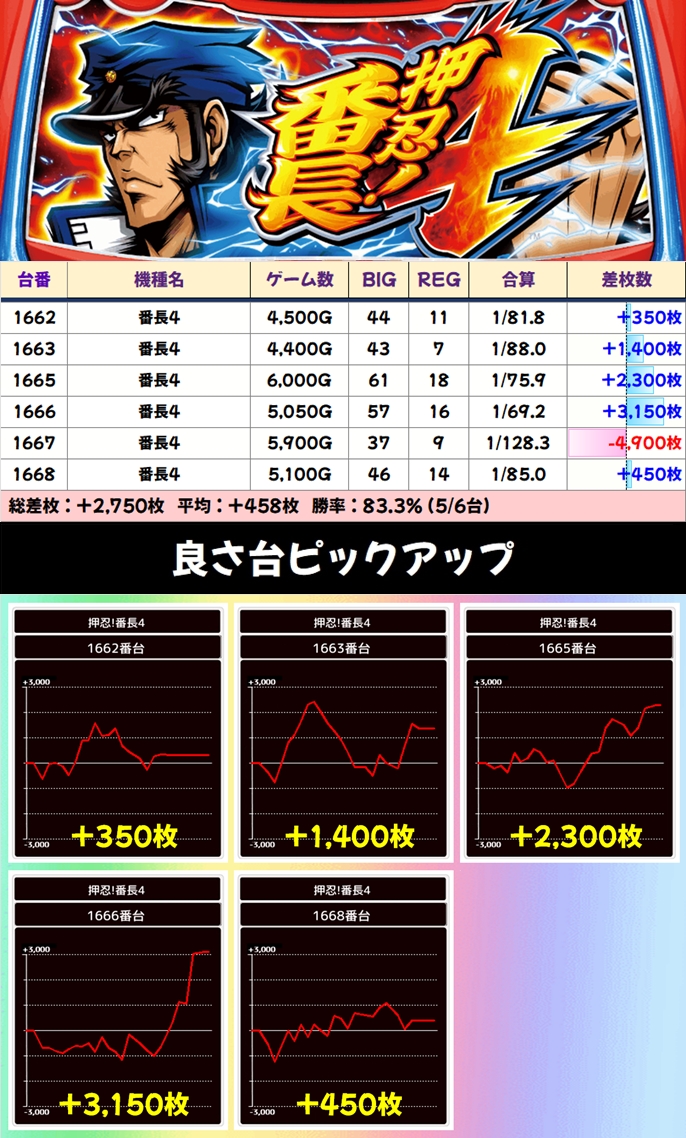 番長4も勝率83.3%、+3150枚が飛び出す安定した結果となりました。