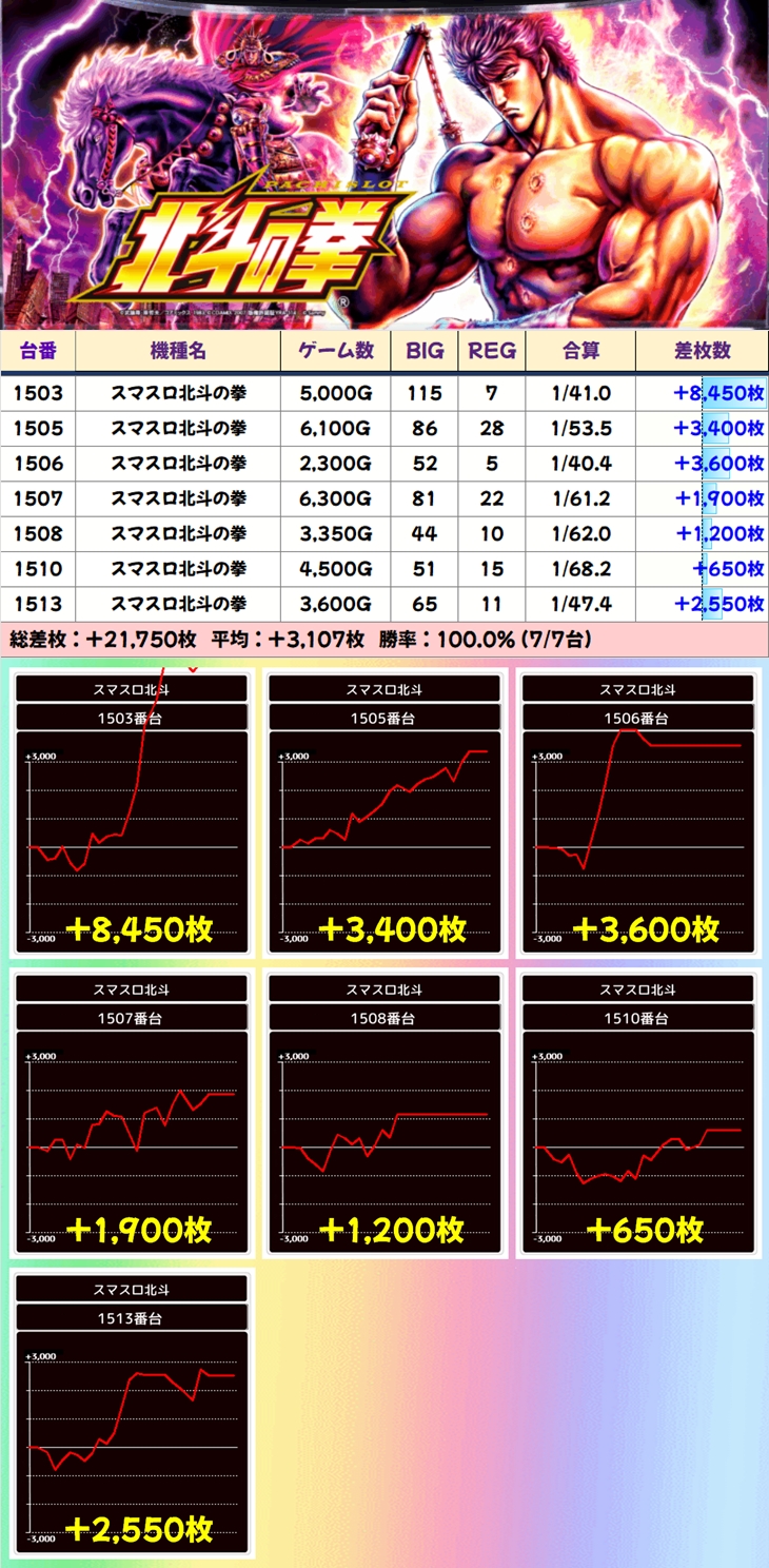【●台連続&単品】スマスロ北斗の拳(計7台)|平均:+3107枚