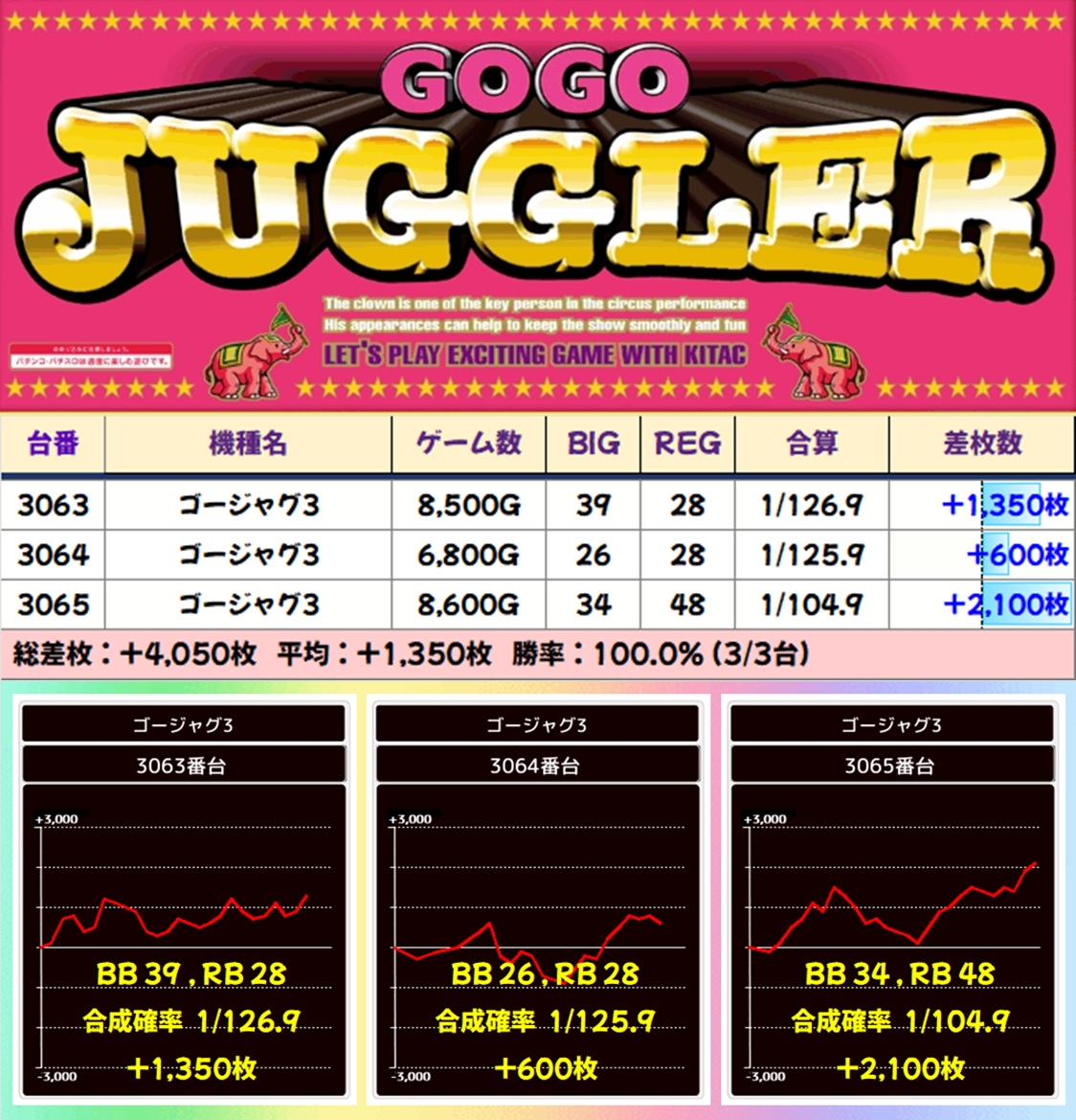 ミスタージャグラーは3台中2台がプラスとなり、平均で+917枚という結果に。マイナスとなってしまった1台もREG出現率は優秀だったので、こちらは全台系濃厚だったかもしれませんね。