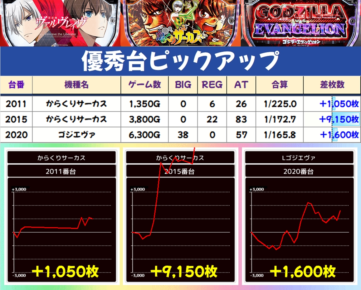 今回の5のつく日は、ゴジエヴァ・ヴァルヴレイヴ・からくりサーカスの挑戦ポスター出現4日目という状況で、こちらからも優秀台を確認することができました。