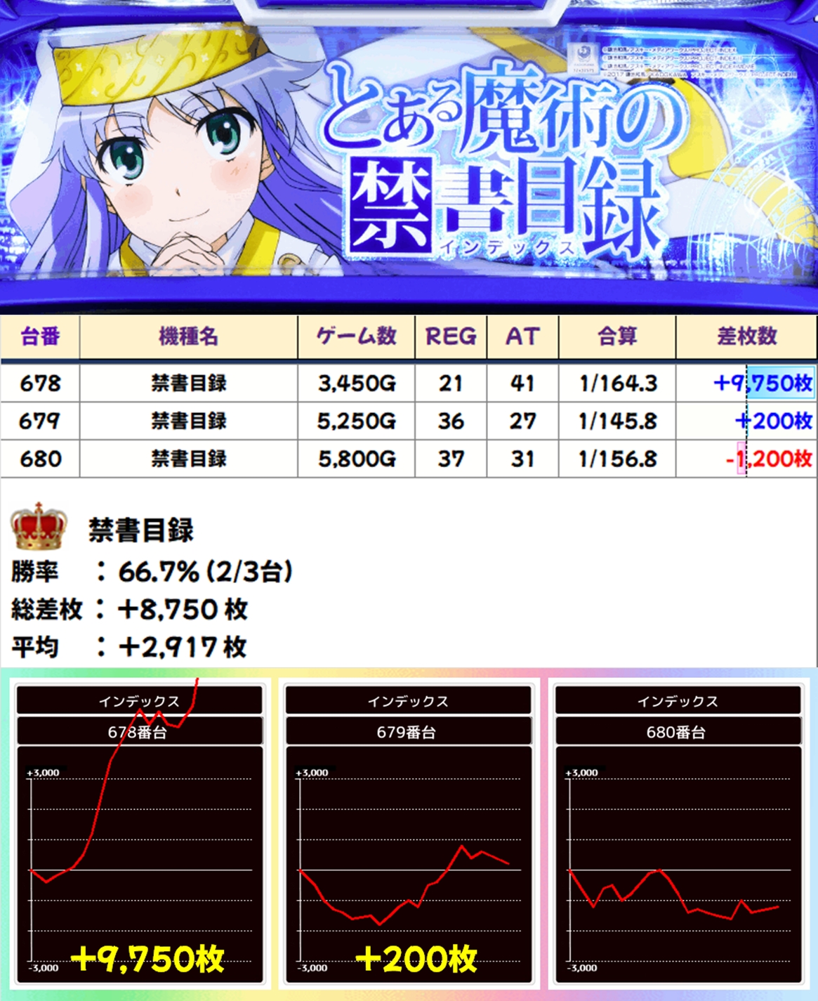 3台設置の禁書目録からは+9,750枚の万枚クラスを確認。1台がマイナスとなってしまいましたが、その1台もしっかり打ち込まれていましたね。
