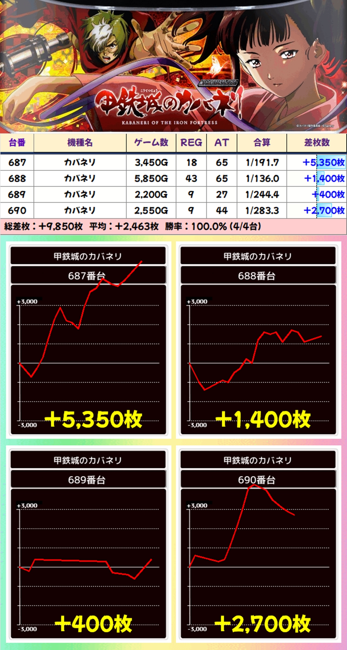 もちろん、マイジャグV以外の毎日カブくぜ機種からも大量出玉が出現!カバネリからは+5,350枚、番長4からは+4,900枚、モンキーターンVからは+3,400枚、戦国乙女4からは+3,500枚と盛り上がりを見せておりました!