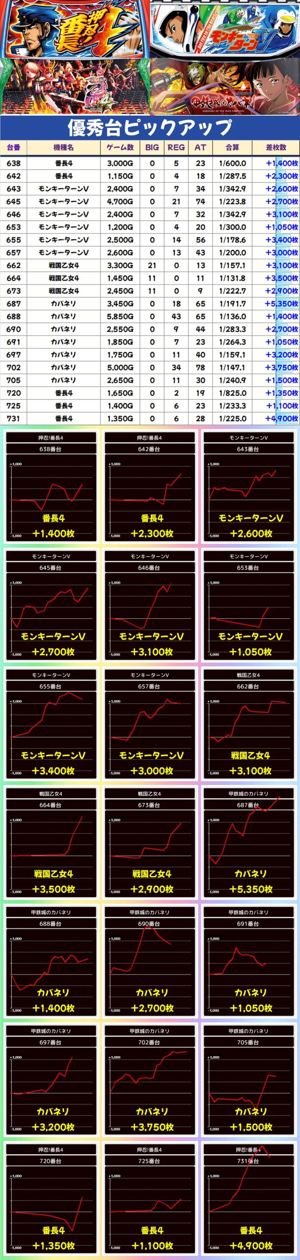 この日は幅広い機種から優秀な出玉を確認。64台が+2,000枚以上の出玉を獲得しておりました!