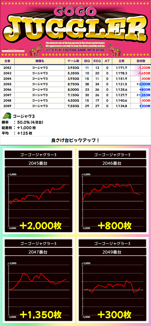 本日のジャグ全体はしっかりプラス!平均+287枚と優秀な結果を残してくれました。