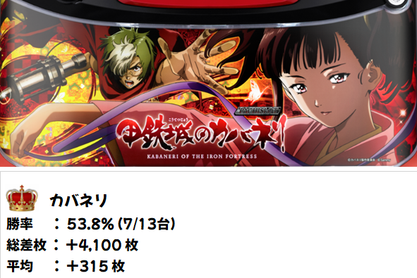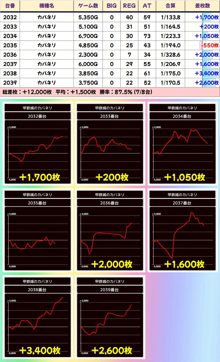 「カバネリ」には8台の大型並びがありました。+3400枚を筆頭に8台中6台がプラスで平均+1500枚を達成!