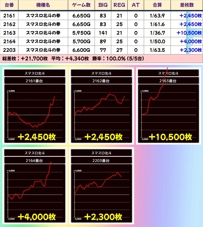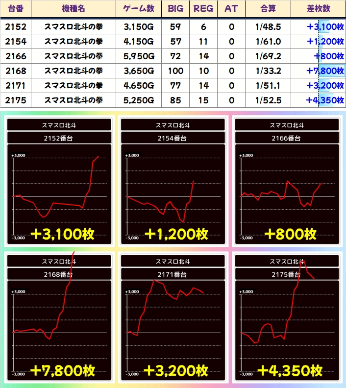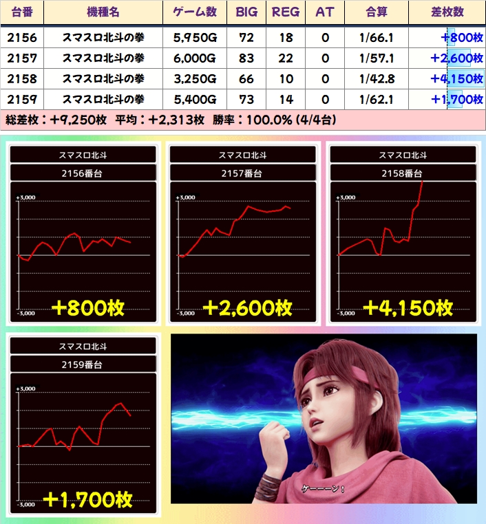 仕掛けの中に万枚を含んだ5台列(平均+4340枚)、全台余裕でプラスの4台並び(平均+2313枚)、+7800枚を筆頭に各列に1台以上などがありました!