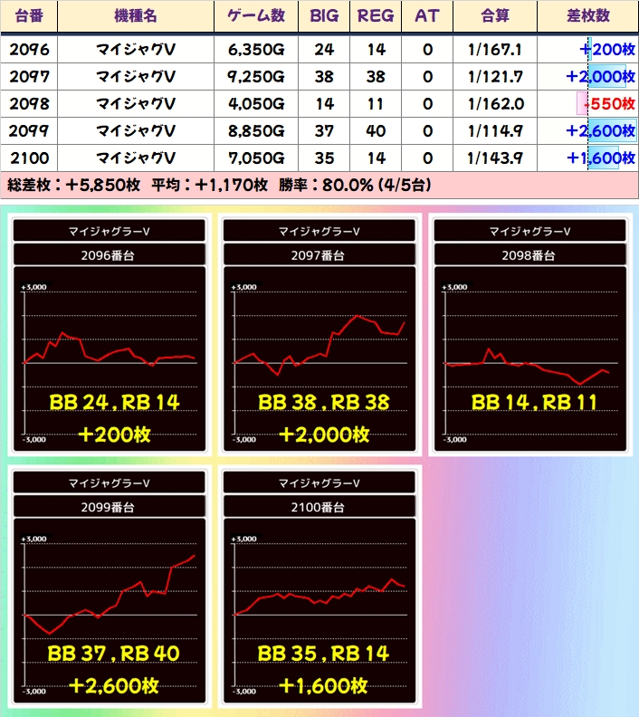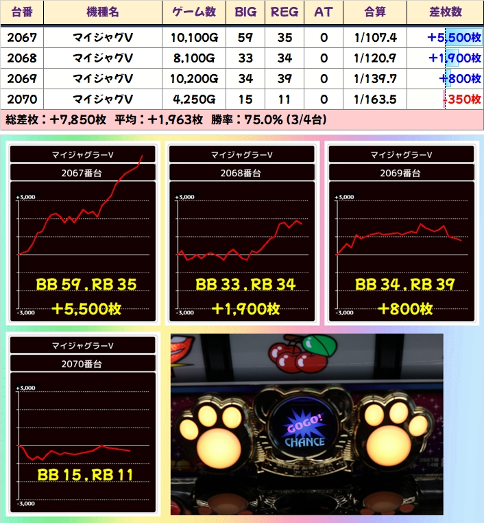 「マイジャグV」には5台並びと4台並びがありましたが、共に平均+1000枚以上を記録!