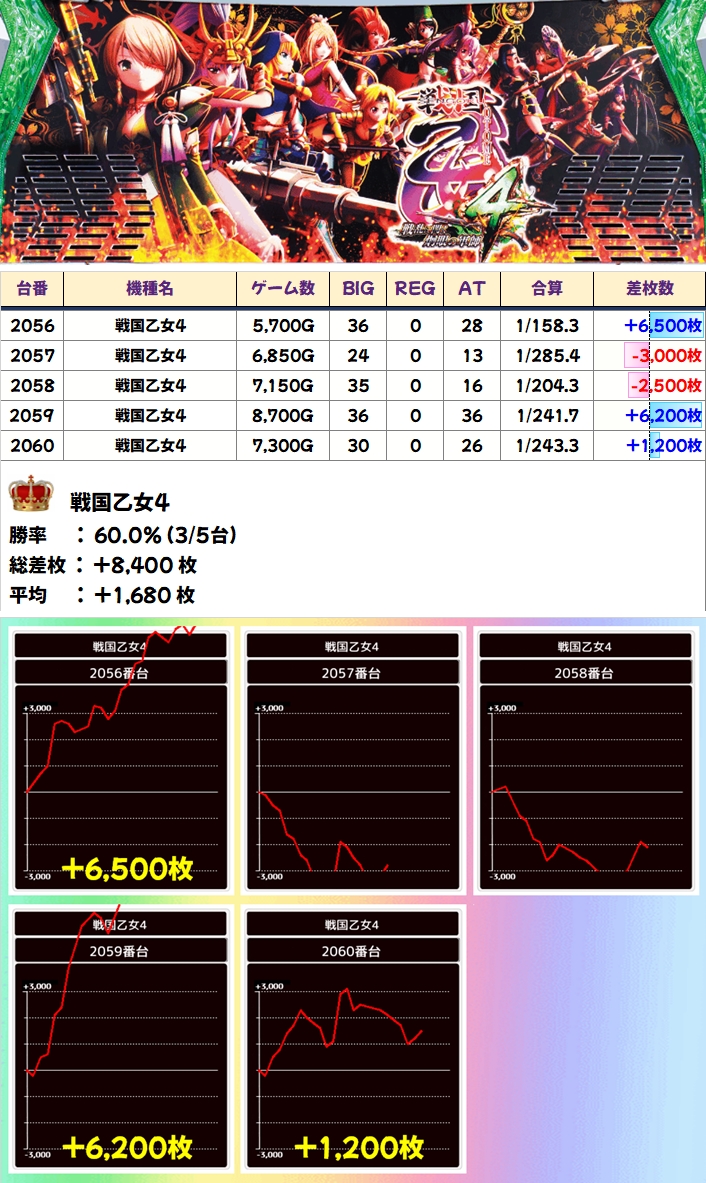 「戦国乙女4」には+6000枚以上のモンスター級が2台ありました。マイナスの台もフル稼働に近いくらい回っているので打ち続ける根拠はあったかなと。