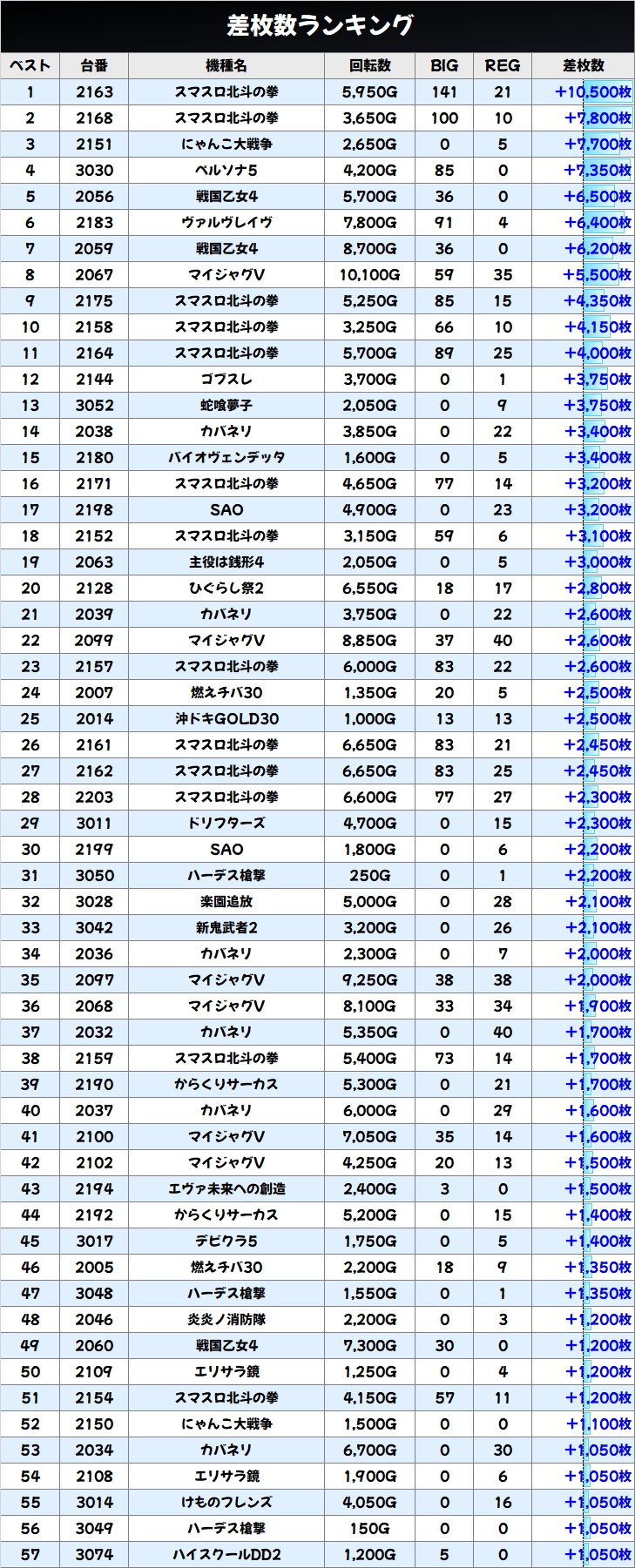 スマスロ北斗の万枚を筆頭に+1000枚以上の台も約60台と今回の土曜日も盛り上がっていました! 次回も期待しましょう!