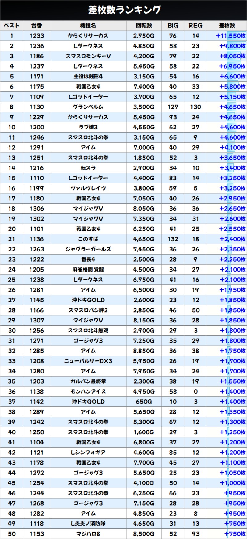 最後にこの日の差枚数ランキングをチェック!+11550枚のからくりサーカスが1位、+9800枚のToLOVEるダークネスが2位、+8050枚のモンキーターンVが3位にランクインしました。またこの日は、3千枚オーバーが16台ありました。