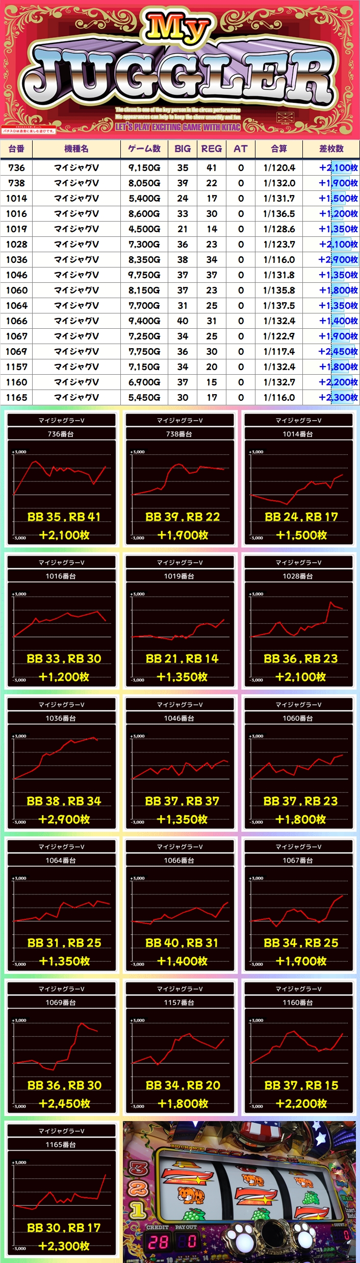 末尾⑥番台は機種を問わず好結果になっており、+5000枚overの大幅プラスとなった台も複数確認できました。
