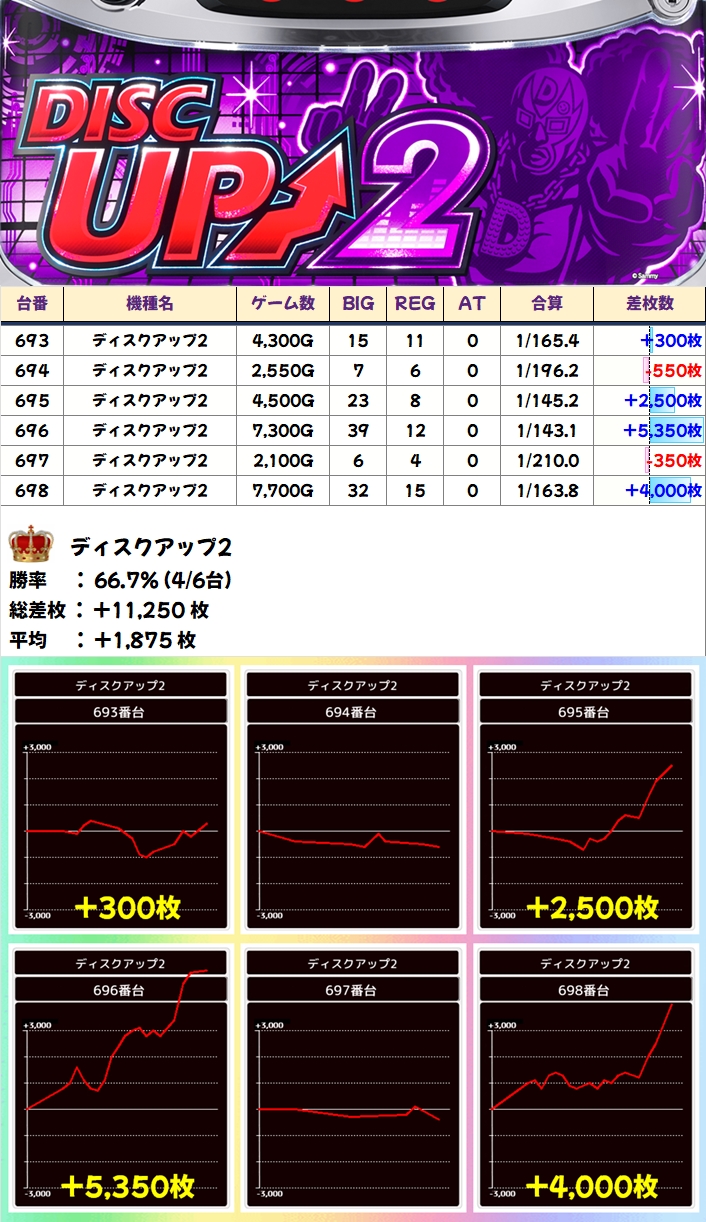 この日はスマスロからキン肉マンが全台系の対象になっており、台平均+3250枚かつ6台中5台プラスと優秀な結果を残していました。