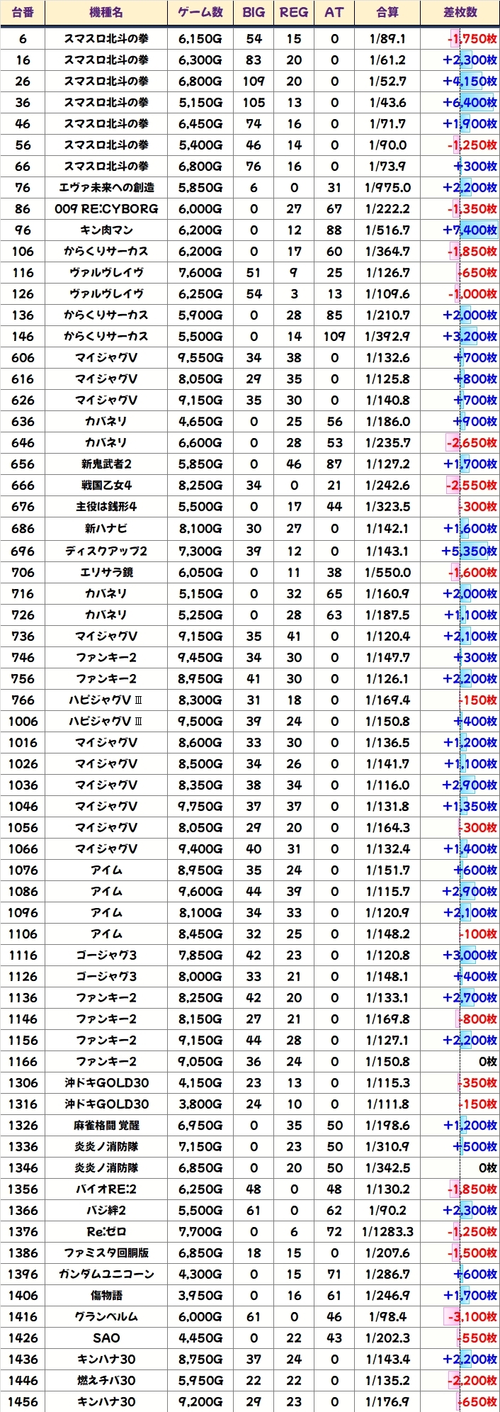 また、末尾⑥番台を中心に大幅プラスの台を多数確認でき、約70台が+2000枚以上を記録していました。