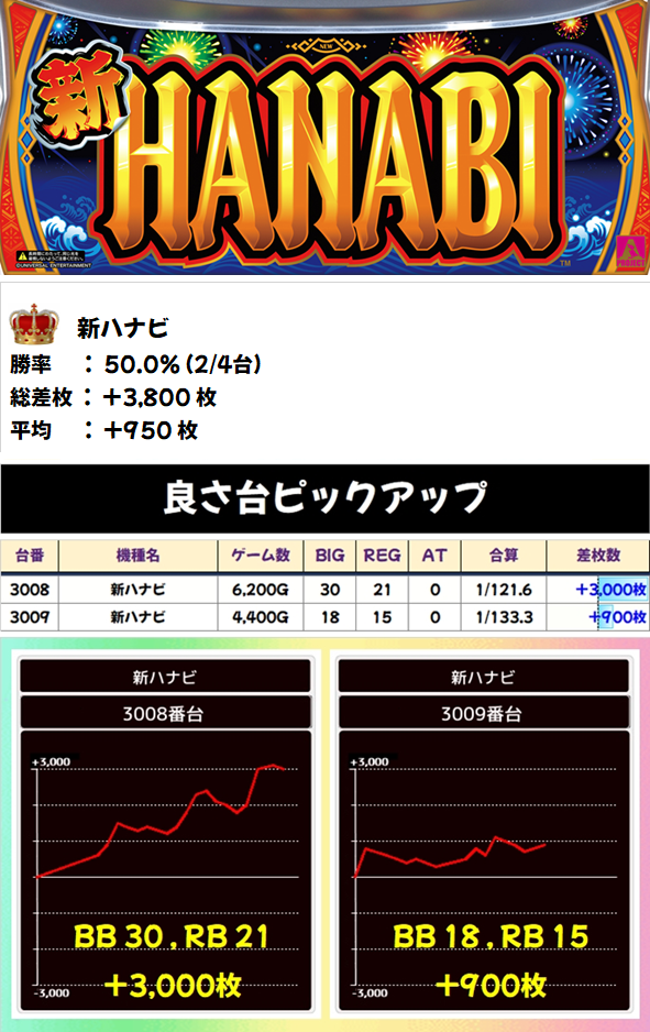 新ハナビで+3000枚を叩き出した3008番台は、ボーナス合算が1/121と設定⑥を遥かに凌駕する素晴らしい台でした!