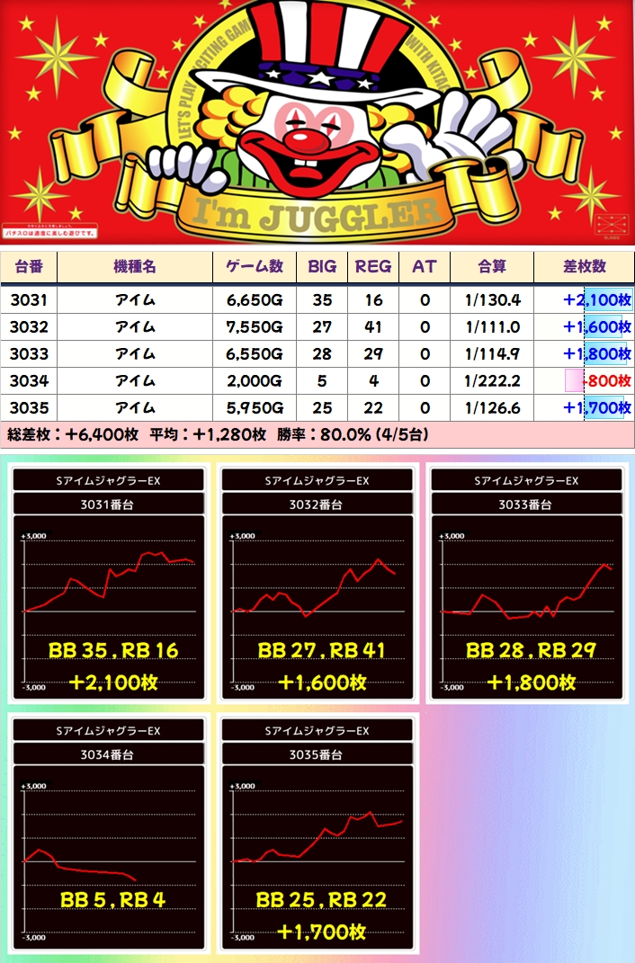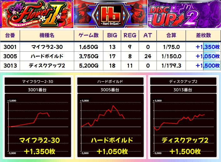 今回も手厚い仕掛けで+1000枚以上が約50台で、平均差枚+103枚、総差枚+21950枚とバッチリ結果を残しました!