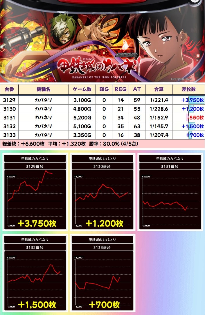 「カバネリ」の仕掛けも並びでした! +3750枚を筆頭に5台中4台がプラスで平均+1320枚を達成!